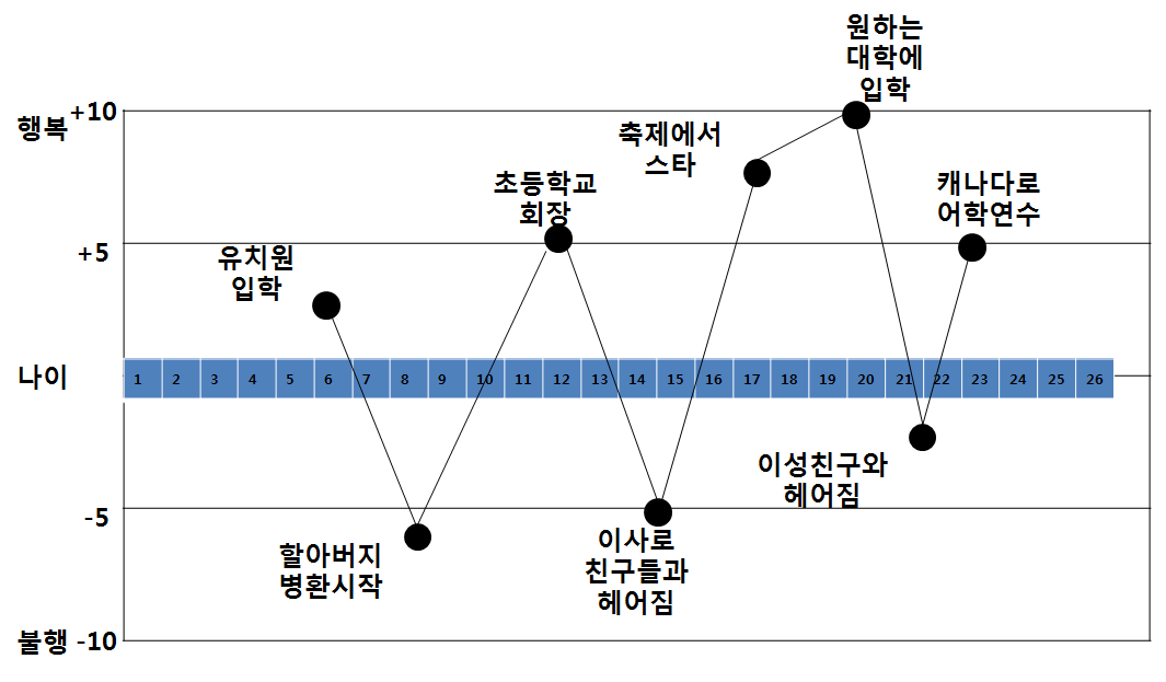 가로선과 세로선이 만나는 지점이 바로 ‘0'이 되고 가로선을 기준으로 위쪽이 행복, 아래쪽이 불행이라고 가정합니다. 세로선의 점수는 자신이 한 칸에 몇 점을 줄지 정합니다. 그래프를 그려 넣기 적당한 정도로 위, 아래 점수를 똑같이 써넣습니다. 예를 들어 위쪽에 +5, 아래쪽에 -5 등입니다. 인생에서 큰 일, 계기, 자신에게 가장 중요한 영향을 미쳤던 사건 등을 써봅니다. 행복, 불행 감정을 점수화해도 좋고 영향을 짐작해서 점수로 기입해도 좋습니다. 이사, 전학, 동생의 탄생, 할머니 돌아가신 일, 부모 이혼, 대학교 입학, 등 굵직한 사건도 좋고, 지극히 사적이고 소소한 에피소드로만 채워도 괜찮습니다. 눈을 감고 긴장 이완을 하고 나서 그리면 더 잘 그려집니다.