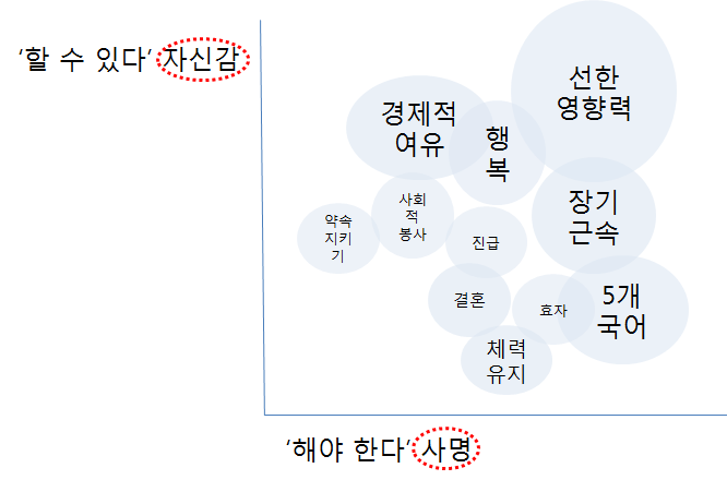 삶의 여행에는 방향성이 필요합니다. 방향성은 가슴을 뛰게 하고, 마음 길을 안내하며, 마음을 단정하게 만들 수 있습니다. ‘해야 한다는 가로(사명)줄과 할 수 있다는 세로(자신감)줄의 조합으로, 동그라미의 크기는 중요성에 따라 크기를 다르게 하여 3차원적 꿈의 지도를 만들어 봅시다.