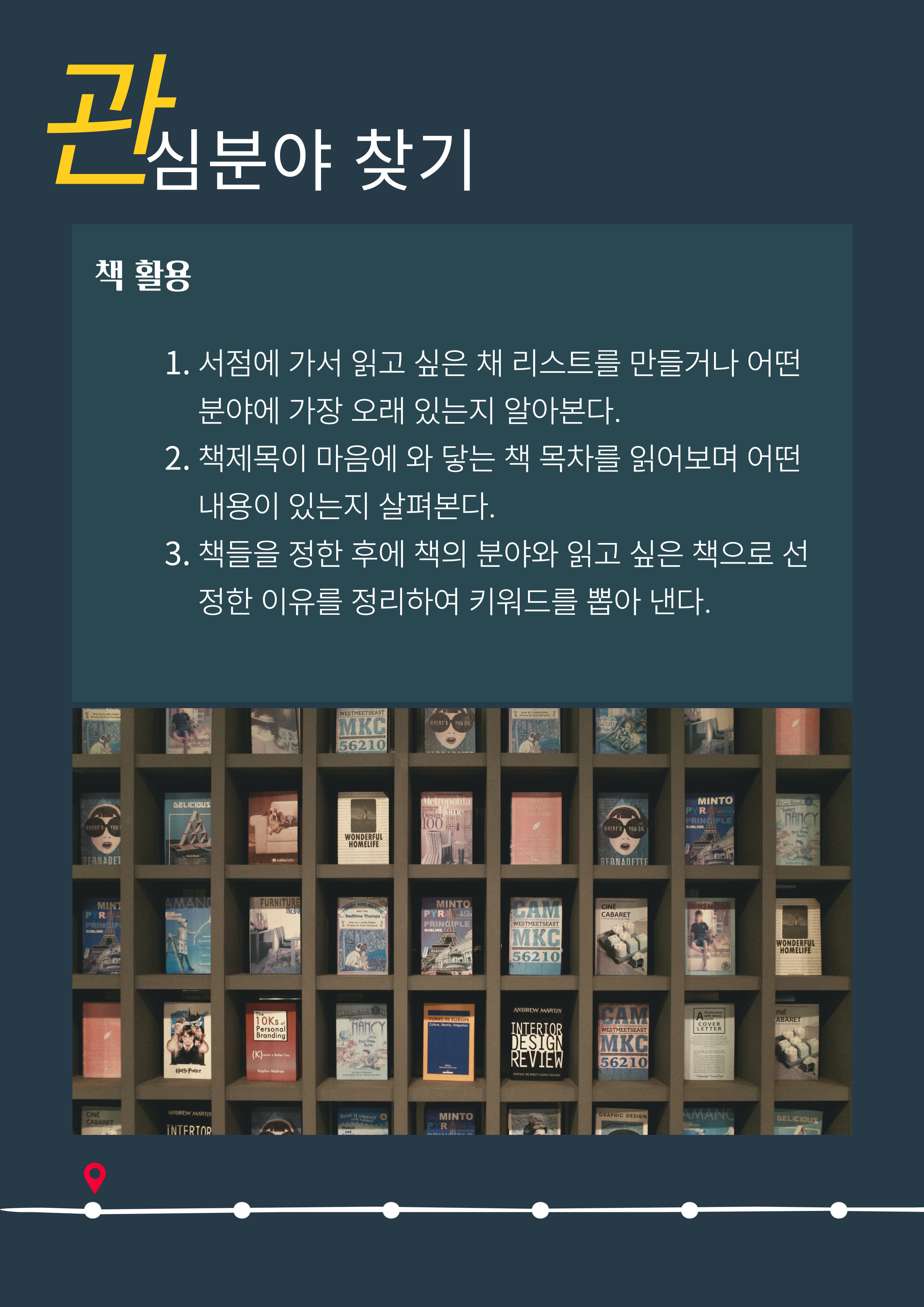 관심 분야는 관심이 가거나 좋아하는 분야에 대해 생각하는 것이다. 책을 활용해서 관심 분야 찾는 방법은 다음과 같다.