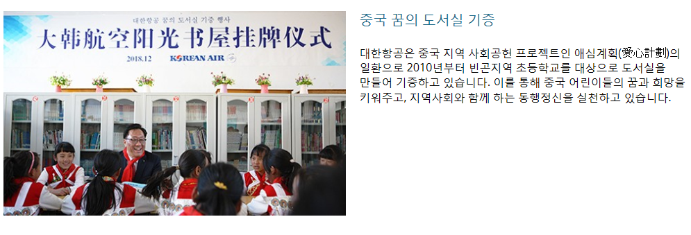 대한항공은 2007년부터 몽골, 베트남, 필리핀, 케냐 등지의 의료봉사 프로그램을 후원하여 심장병 어린이의 치료를 돕고, 2008년 이라크의 평화정착 및 재건사업 등에 동참하였습니다. 이는 대한항공이 국적을 넘어 필요한 곳에 적극적으로 도움의 손길을 내미는 대표적 사례라 하겠습니다. 이와 더불어 연중 지속적으로 지역사회 자원봉사, 기부금, 구호품 수송 및 체육문화 사업 등의 후원 활동을 하며 사회 구성원으로서 기업의 역할에 최선을 다하고 있습니다.