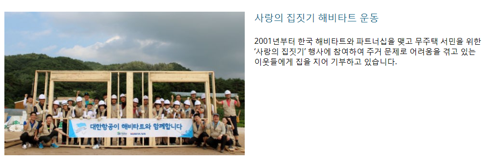 대한항공은 2007년부터 몽골, 베트남, 필리핀, 케냐 등지의 의료봉사 프로그램을 후원하여 심장병 어린이의 치료를 돕고, 2008년 이라크의 평화정착 및 재건사업 등에 동참하였습니다. 이는 대한항공이 국적을 넘어 필요한 곳에 적극적으로 도움의 손길을 내미는 대표적 사례라 하겠습니다. 이와 더불어 연중 지속적으로 지역사회 자원봉사, 기부금, 구호품 수송 및 체육문화 사업 등의 후원 활동을 하며 사회 구성원으로서 기업의 역할에 최선을 다하고 있습니다.