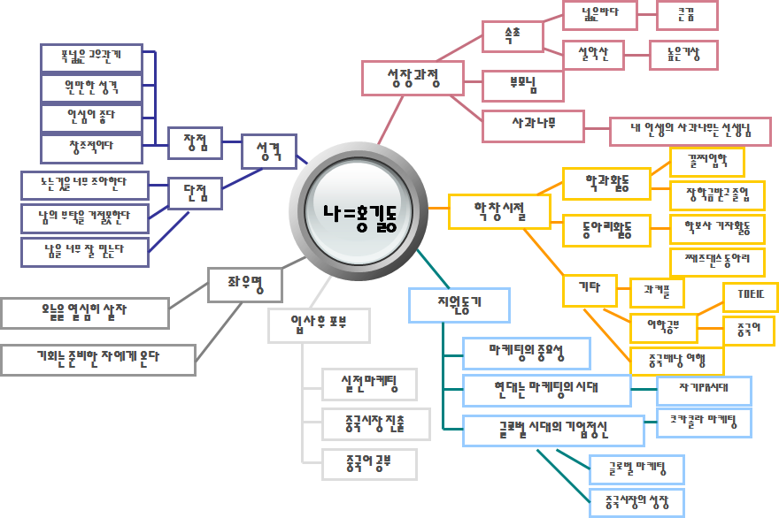 아래와 같이 마인드맵을 통해서 자기소개서를 쓸 아이디어를 수집해 봅니다.